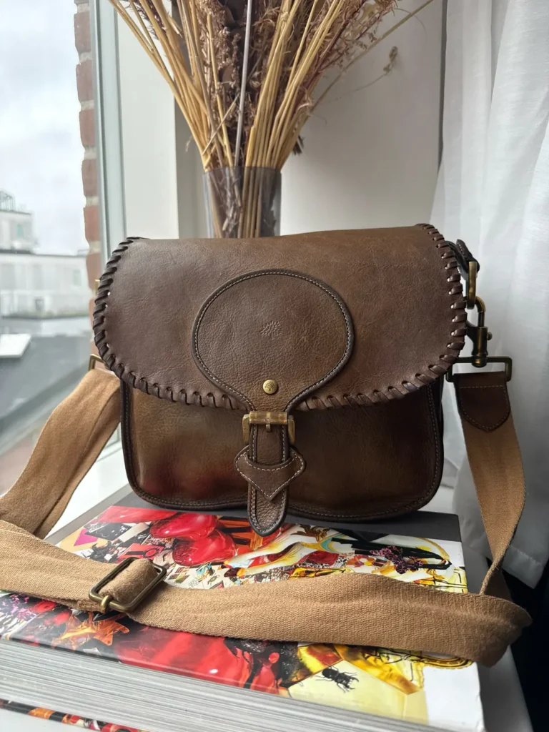 En elegant og sofistikeret Mulberry Leighton – et design, der kombinerer klassisk britisk håndværk med moderne femininitet. Tasken er udført i smidigt kalveskind med naturlig, minimal glans, hvilket giver et luksuriøst og raffineret udtryk. Den varme chokoladebrune farve står smukt til det gyldne hardware og de elegante aftagelige remme.